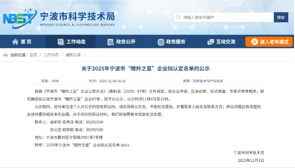 近日,宁波市科学技术局发布《关于 2025 年宁波市 “瞪羚之星” 企业拟认定名单的公示》,“瞪羚企···